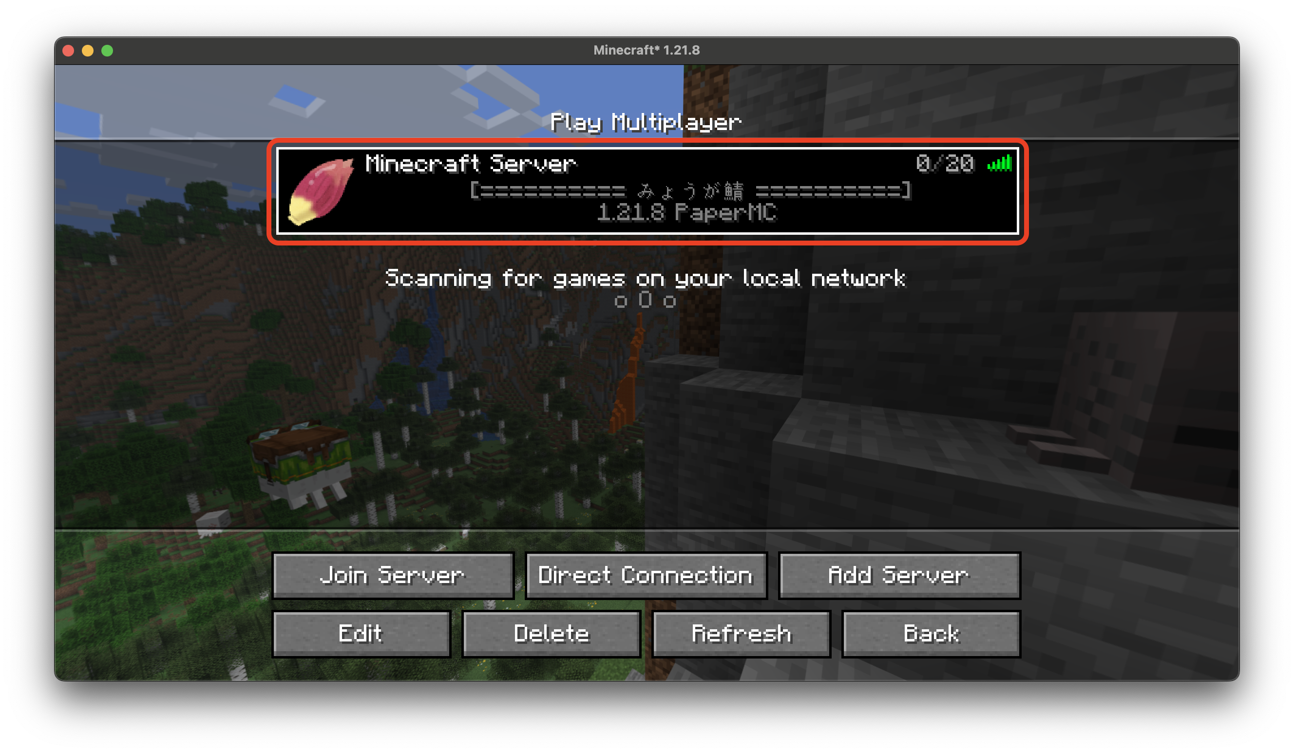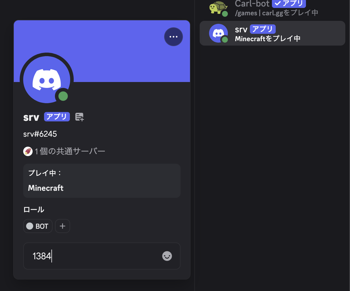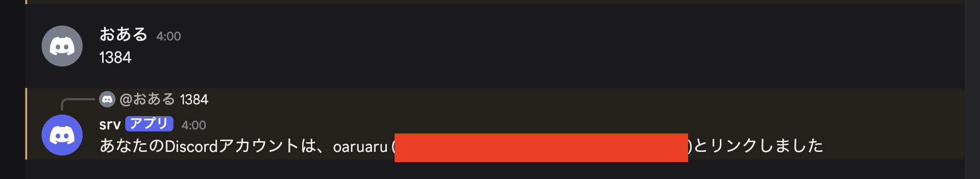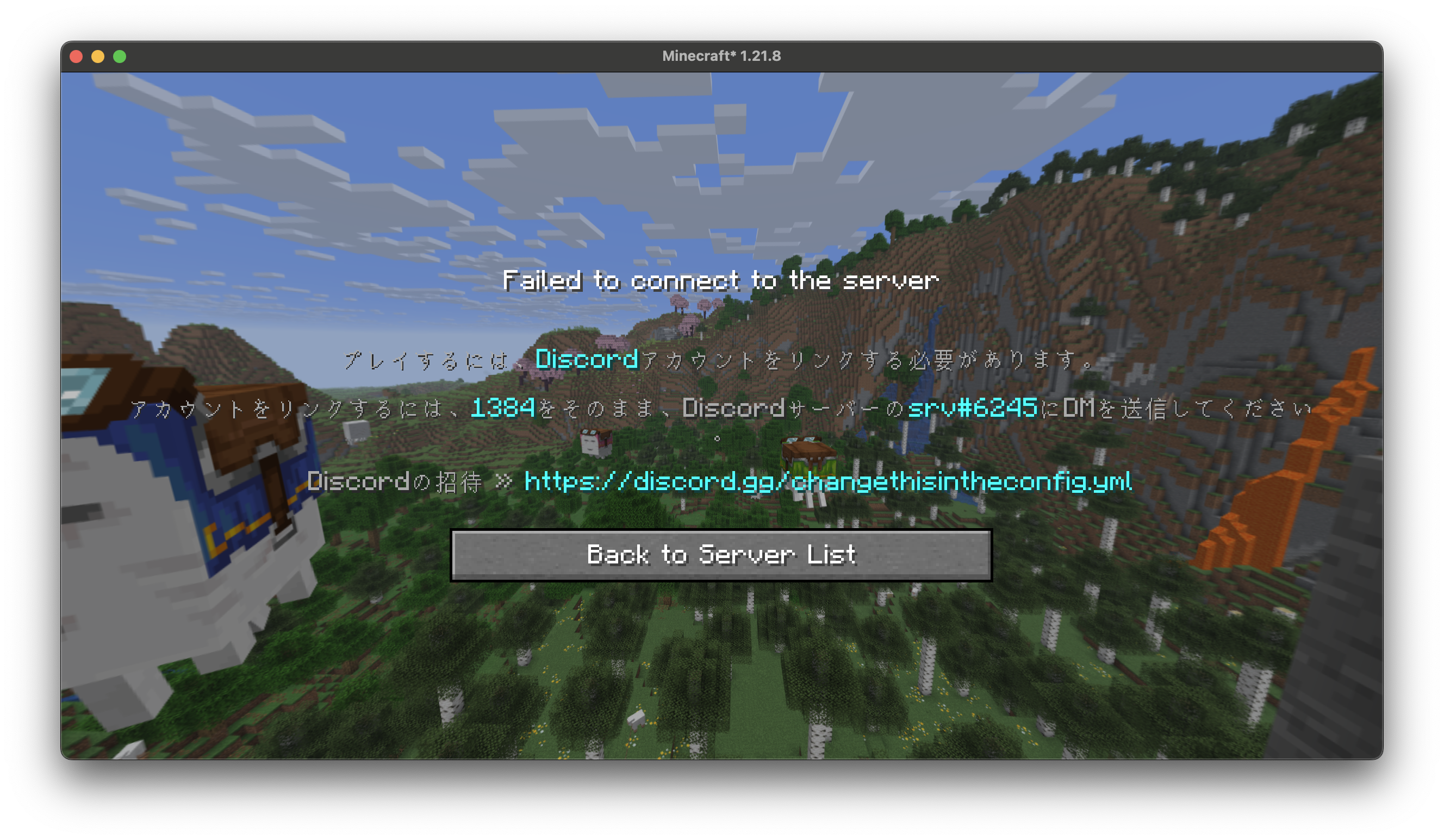 みょーが鯖/ドキュメント/ゲームに入る方法/ゲームに入る方法2025/08/20著者oaruaru頭の弱い学生です。スマホが好きです。目次前提サーバーを追加アカウントのリンク参加できる!注意目次前提サーバーを追加アカウントのリンク参加できる!注意前提#Discordに参加していることサーバーを追加#Discord内のアドレスの書いているチャンネルでアドレスを確認し追加してください。アカウントのリンク#最初サーバーに入ろうとすると以下のような画面が出る。4桁の数字をサーバー内にいるsrvに送ります。リンクされるとBotから返信が来ます。参加できる!#一度サーバーリストに戻ってもう一度入ると今度は参加できる。注意#Discordに参加していない場合、サーバーに入ることはできません。